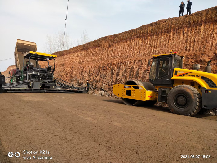 山推SRP12-C5 MA攤鋪機與SR26H-C5壓路機完美配合,助力河南某道路水穩基層建設,施工寬度10m,作業厚度230mm,連續三層施工作業,高效,高質量施工,獲得客戶的一致好評。