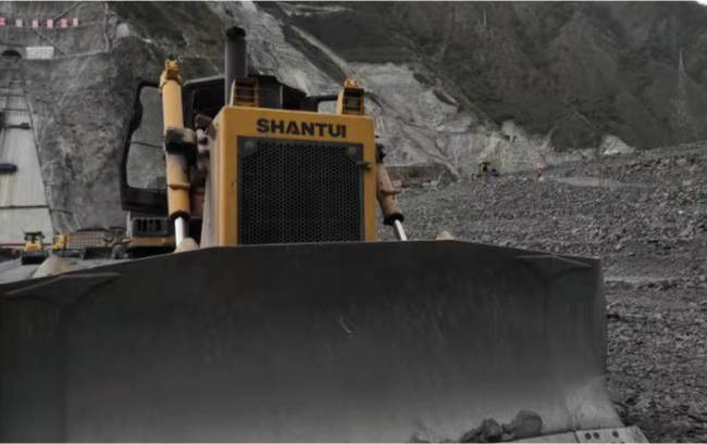 SD32推土機(jī)進(jìn)行西南地區(qū)水電站壩體建設(shè),推土機(jī)將土、石子等松散物料進(jìn)行推移堆積,壓路機(jī)壓平,澆注混凝土形成壩體。